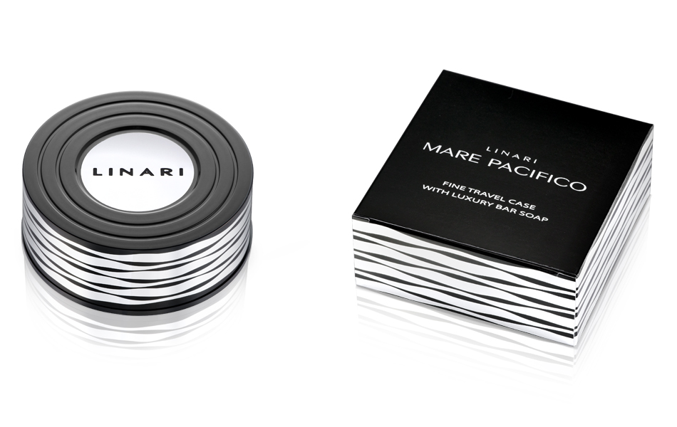 The preciously decorated design of the glossy-black Fine Travel Case with a platinum coloured sophisticated wavy pattern, corresponds with the pattern of the equivalent perfume flacon. The unique, dual-purpose travel case will gently cradle the enclosed white LINARI-MARE PACIFICO 100 g Bar Soap, emphasising the pure design of LINARI products. It may also be used as a luxurious bar soap dish. Made in Germany.