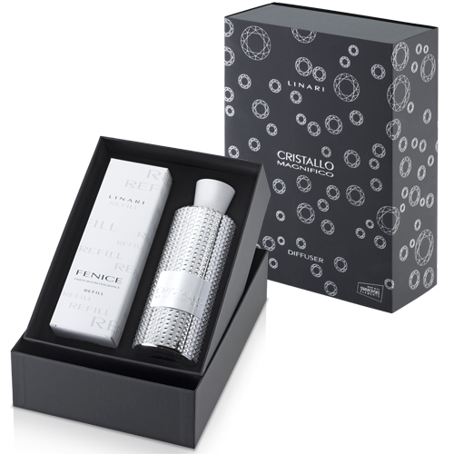 Auflage besitzt der CRISTALLO-MAGNIFICO Diffusor ein großes Potential als zeitloses Sammlerstück. CRISTALLO-MAGNIFICO wird mit jedem individuell gewünschten Raumparfüm aus dem LINARI-Sortiment geliefert.