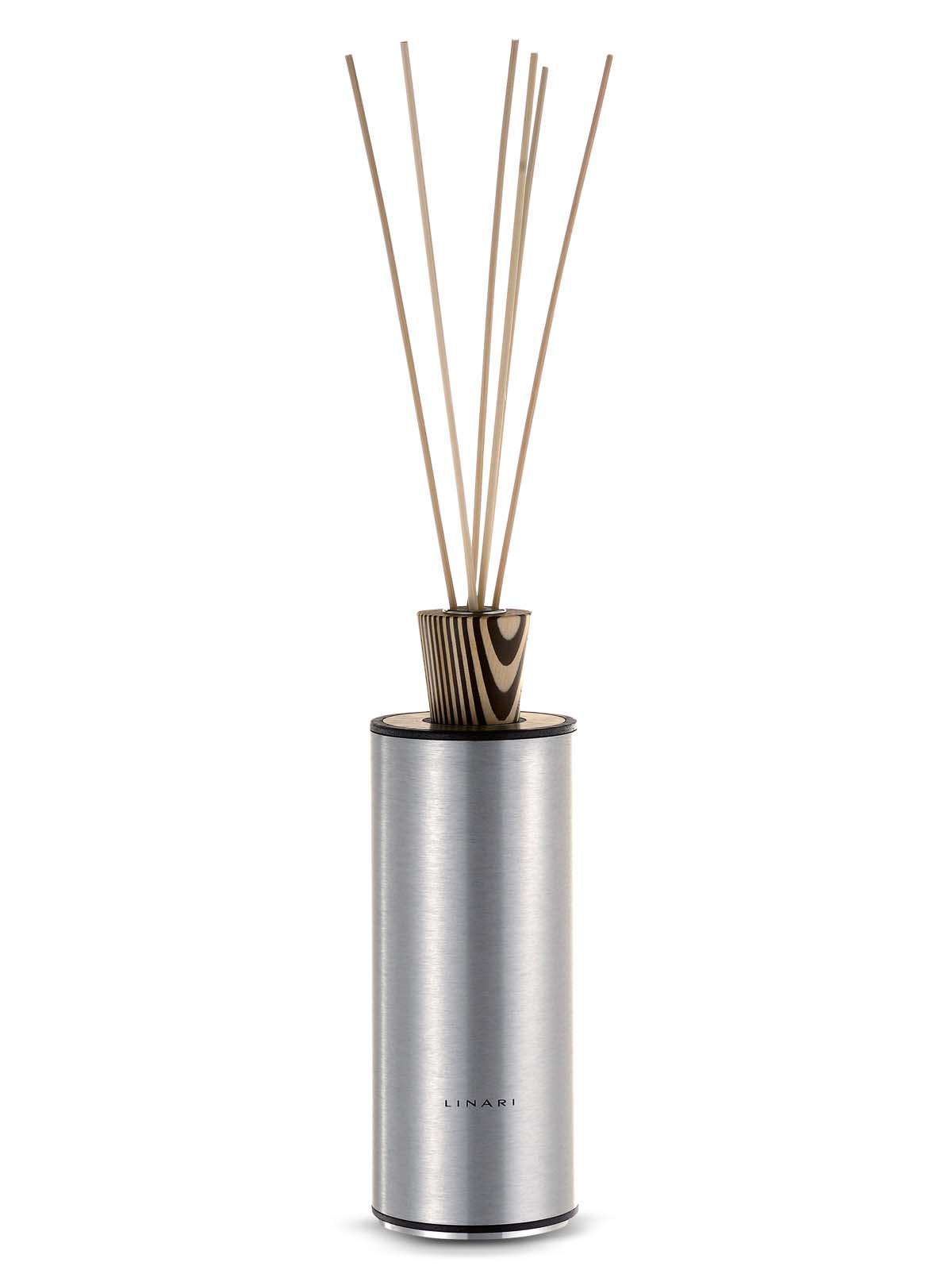 In Handarbeit zusammengesetztes avantgardistisches Aluminiumcover mit hochdekorativer Bürstoptik, das mit gedrehten massiven Holzdeckeln und -Böden versehen ist. Das Diffusor-Cover kann für nahezu alle LINARI-Diffusoren verwendet werden.