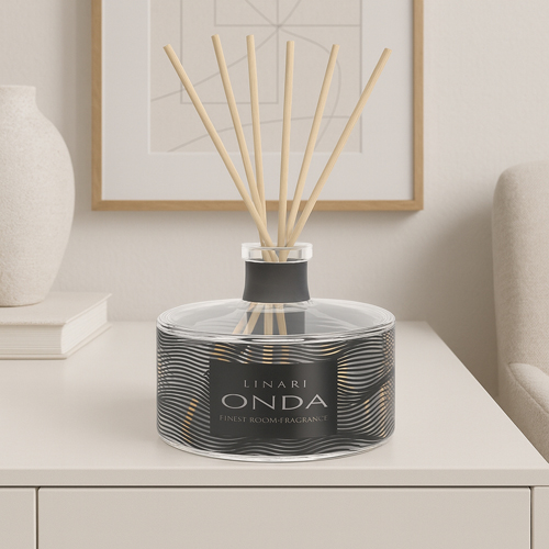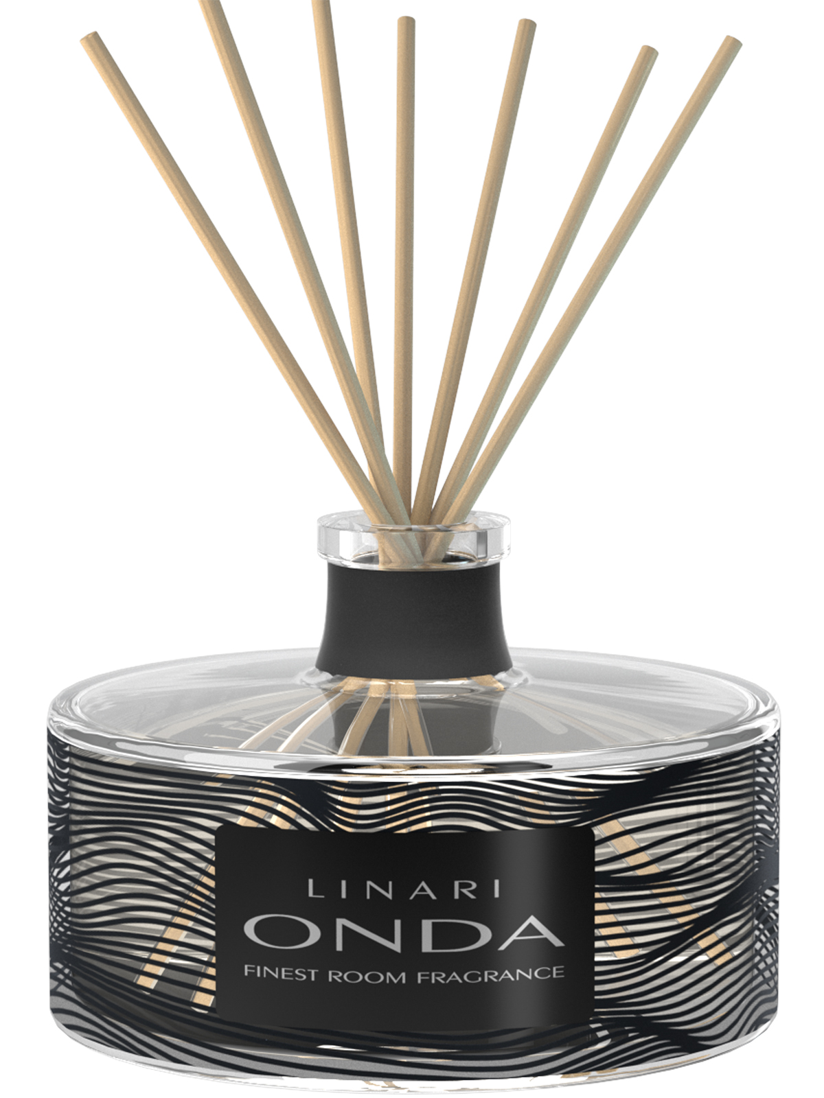 LINARI reinvents itself with the unique 3000 ml GRANDEZZA SUPERIORE diffuser. The large cylindrical bottle diameter leads to an exceptionally large evaporation surface. In combination with the usage of the seven naturally coloured evaporation sticks, the scent diffusion is maximised. The gorgeous wave design of the flat diffuser bottle of premium glass represents an avant-garde milestone. In contrast to the highly transparent, cylindrical glass surface, the deep black and abstract wave decor seems to organically surround the bottle. It matches perfectly with the textured, superior hand-sewn black stretch ribbon around the bottle neck. The label with an innovative soft-touch surface and fine gloss lettering complete the avant-garde look. Estimated time of usage: 9 – 12 months, dependent upon environment.